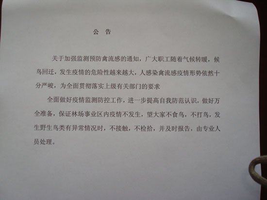 2013年禽流感在林场周边流行蔓延,林场急时对林场职工发出公告,并采取急时防疫。